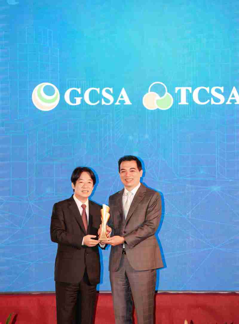达全方位永续表现获全球永续奖及台湾永续奖肯定,,由副总统赖清德颁奖 (左),,森林舞会总经理柯富仁 (右) 代表领奖