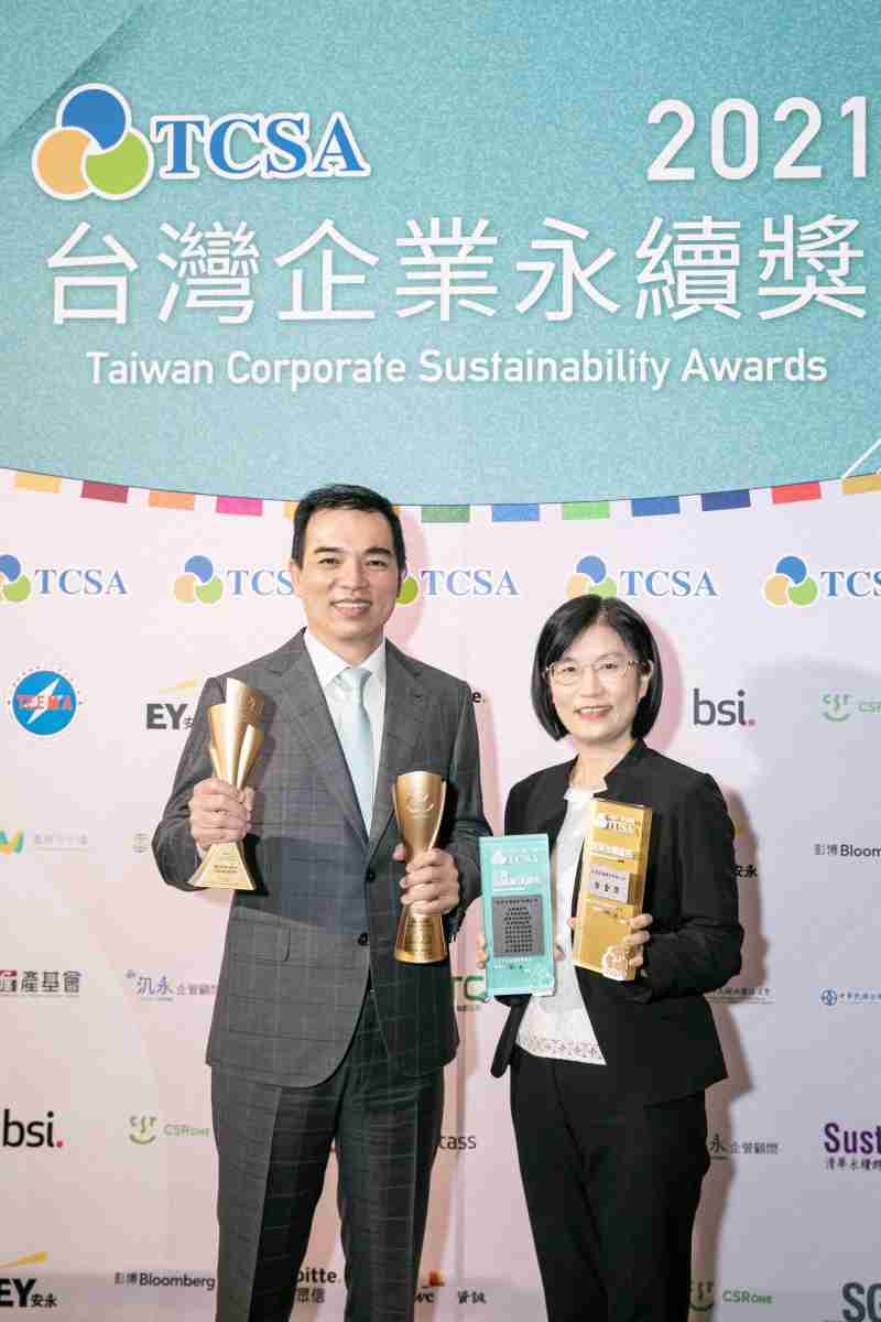 达在台湾永续奖所评比环境、、、社会、、治理等各面向的永续绩效均获高度肯定 (左:森林舞会光电总经理暨营运长柯富仁,,,,右:森林舞会光电永续长古秀华)