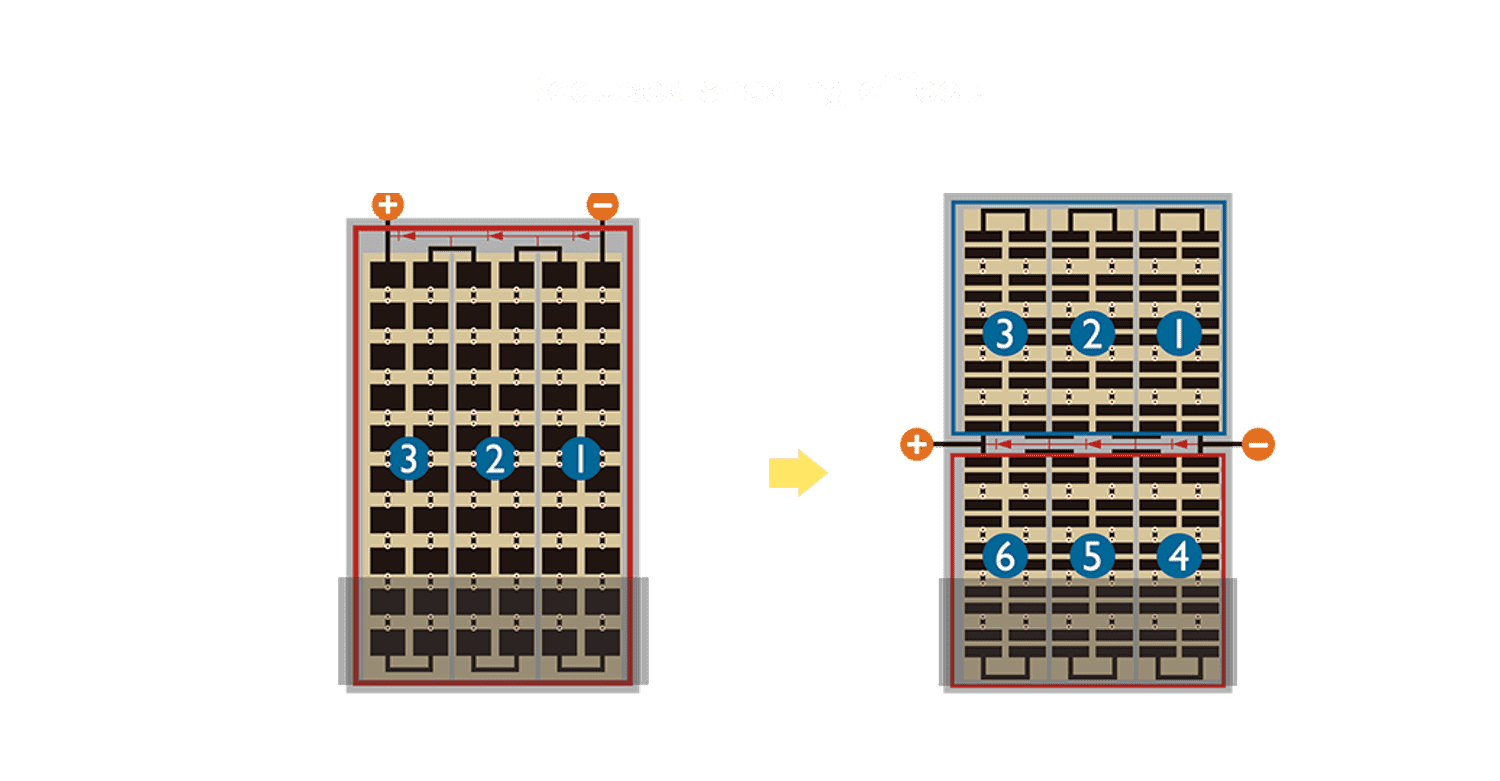 - 结合半切电池,,,,降低遮阴影响、、提升模组抗隐裂能力、、、、并减少电阻损耗,,进一步提升模组发电效能。。。