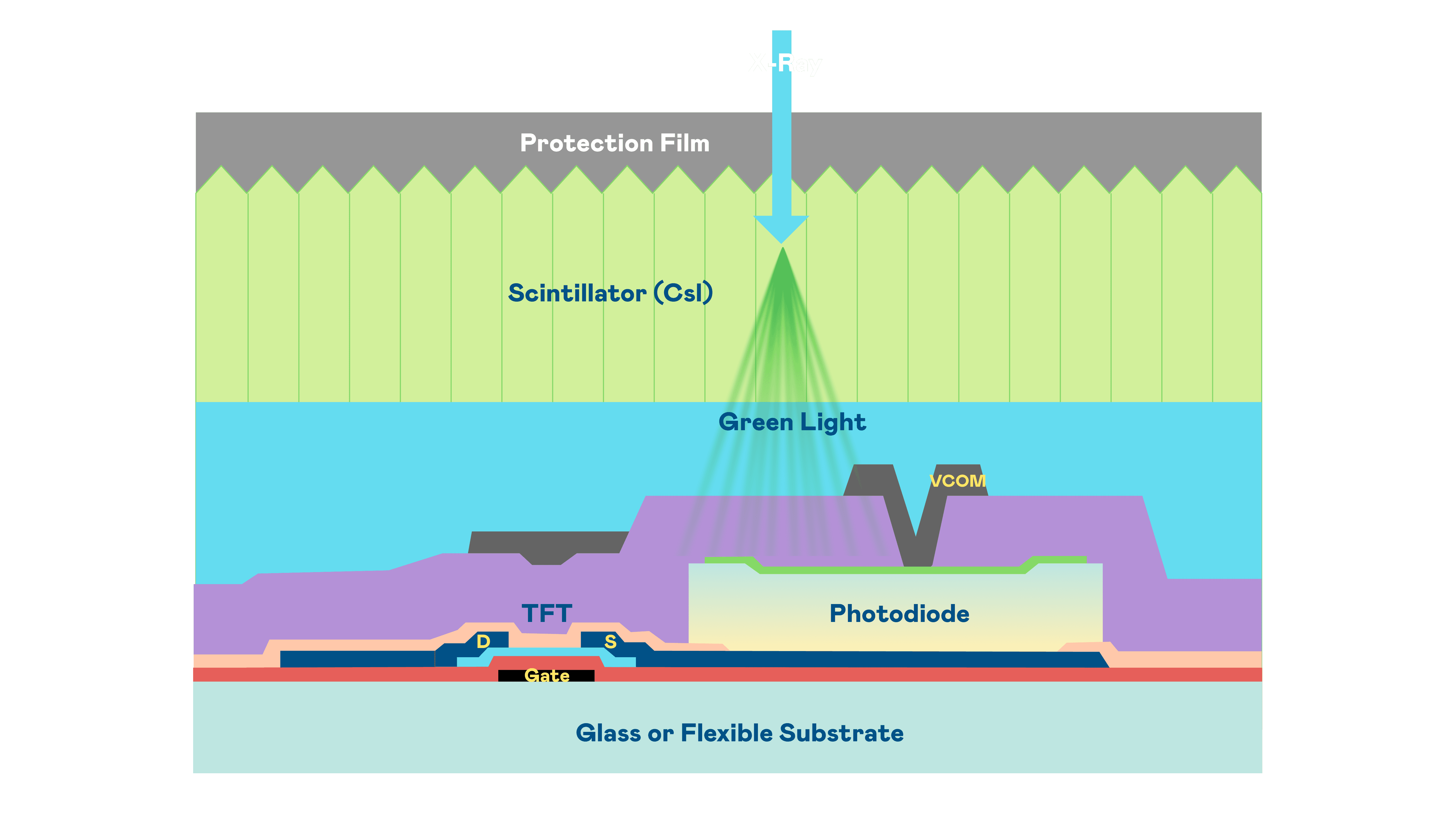 森林舞会的X光影像感测阵列使用薄膜电晶体 (TFT) 作为每个像素的读取开关,,,,搭配光电二极体(Photodiode)的光电转换元件,,,,用以感测X光影像讯号。。。。